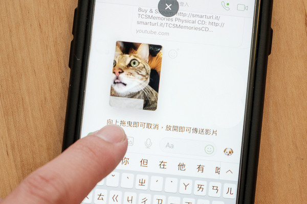 此次更新的另一項重點,就是在於介面欄位左側的拍照、傳送照片與語音訊息等三大程式,在先前我們都需要單點圖示才能開啟功能;但目前新版本只要單手長壓圖案,就能快速拍照、錄影和錄製語音訊息。實測之後發現按壓相機可變為錄影、照片圖案則是拍照,麥克風為錄音,並會出現相應的取景視窗方便拍攝。