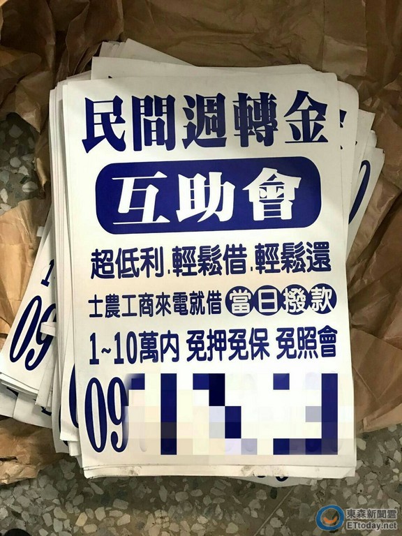 ▲髙利貸集團到處發放傳單、貼紙,假藉低率借款騙取信任,再以年息720分的超高利率收取利息。(圖/台東縣警察局提供)