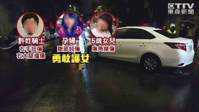 新北市一名許姓騎士行經永和耕莘醫院附近,遭到一台疑似要迴轉的轎車撞上,然而騎士當時載著懷孕7個月的妻子和5歲女兒,他右手、大腿受傷無法動,但妻子看到女兒嘴角流血,不顧自己也受傷,挺著肚子趕緊保護女兒,所幸送醫後都只有輕傷,沒有大礙,讓人「撞見」到偉大母愛。