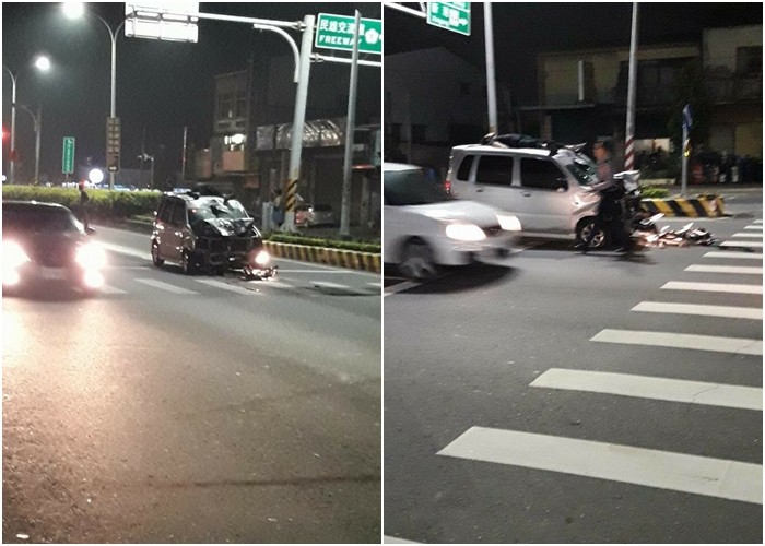 這起車禍地點位於民雄鄉協志陸橋下與建國路口,15日晚間這起嚴重車禍,30多歲莊男開車行經該路口時遇到紅燈,他完全沒剎車、高速追撞整排停紅燈的多輛機車,掃倒一排騎士。