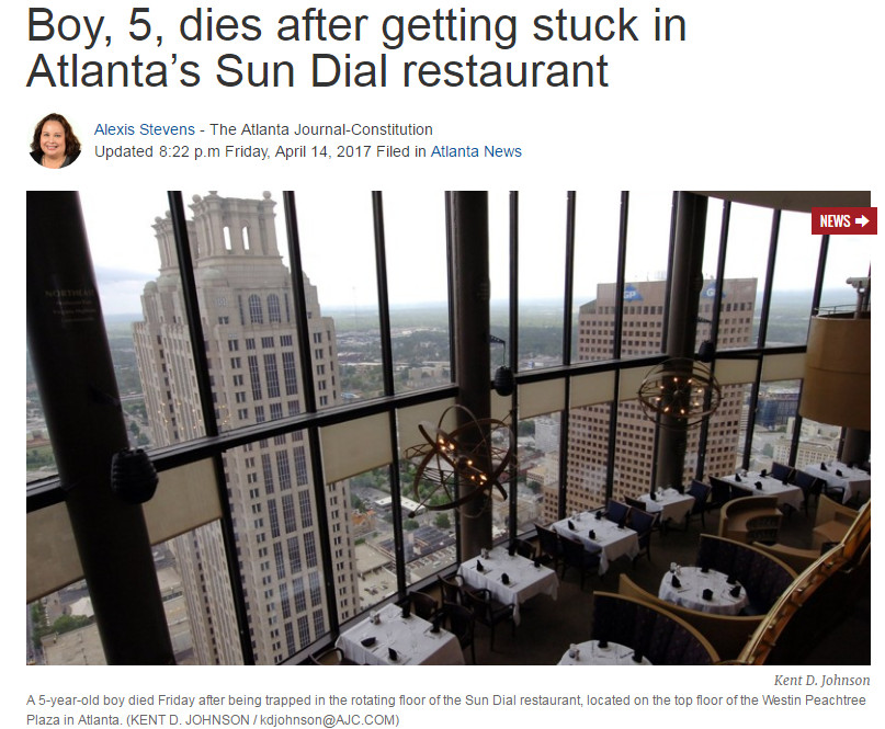 美國亞特蘭大一名5歲男童日前和家人到一間73層樓高的旋轉景觀餐廳用餐,卻不慎捲入地板旋轉部份和牆壁間的縫隙,頭部慘遭擠壓重創,送醫不治。