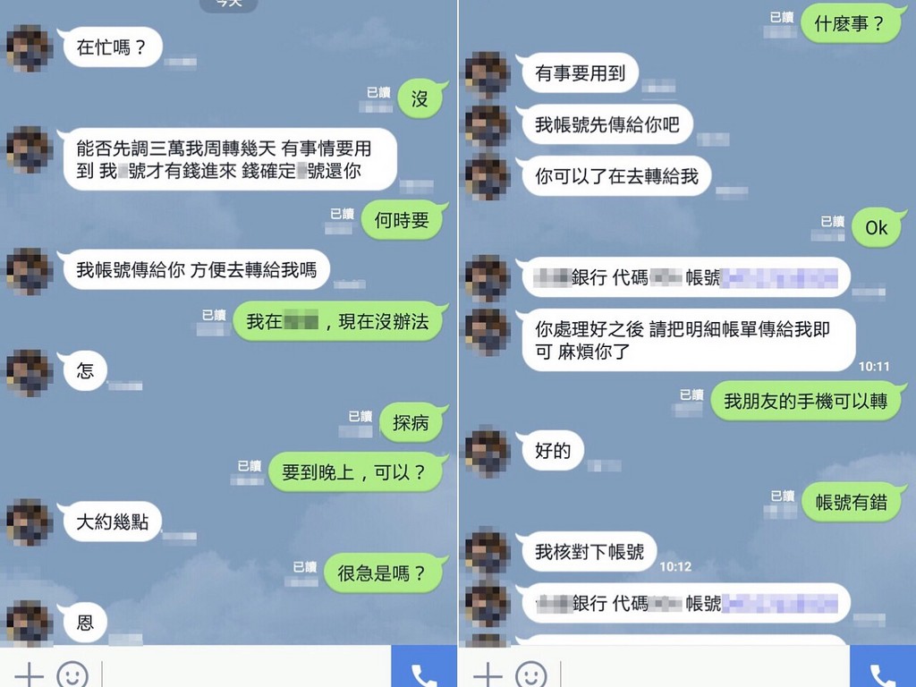 「在忙嗎?」沈寂一陣子的「親友」傳LINE借錢招數又出現!台北市一名56歲江姓女公務員日前到醫院探病,收到同事傳訊息表示希望可以借台幣3萬元周轉,由於其語氣十分著急,江女只好先拜託病床上的友人用手機上網轉帳給對方,沒想到過幾分鐘收到其他友人傳訊息通知該名「同事」帳號被盜,這才發現受騙,同時對方還在想理由要繼續借錢,所幸報警後3萬元全追回。