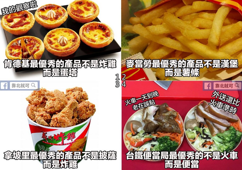 圖中文字寫道:肯德基最優秀的產品不是炸雞,而是蛋塔;麥當勞最優秀的產品不是漢堡,而是薯條;拿坡里最優秀的產品不是披薩,而是炸雞;台鐵便當局最優秀的不是火車,而是便當。