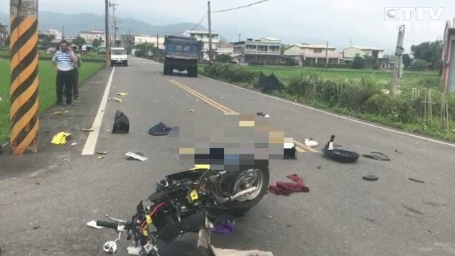 宜蘭縣員山鄉尚深路和168巷口,17日上午10點多發生機車貨車相撞車禍,當時撞擊力道之大,吳姓騎士和後座趙姓女乘客被撞飛,騎士倒臥血泊中到院前死亡,女子則是戴著安全帽躺在一旁,目前仍在醫院急救,現場機車支離破碎,貨車車斗疑似還夾著頭髮及沾著肉塊,附近民眾說,「有聽到很像車輪爆胎的聲音。」