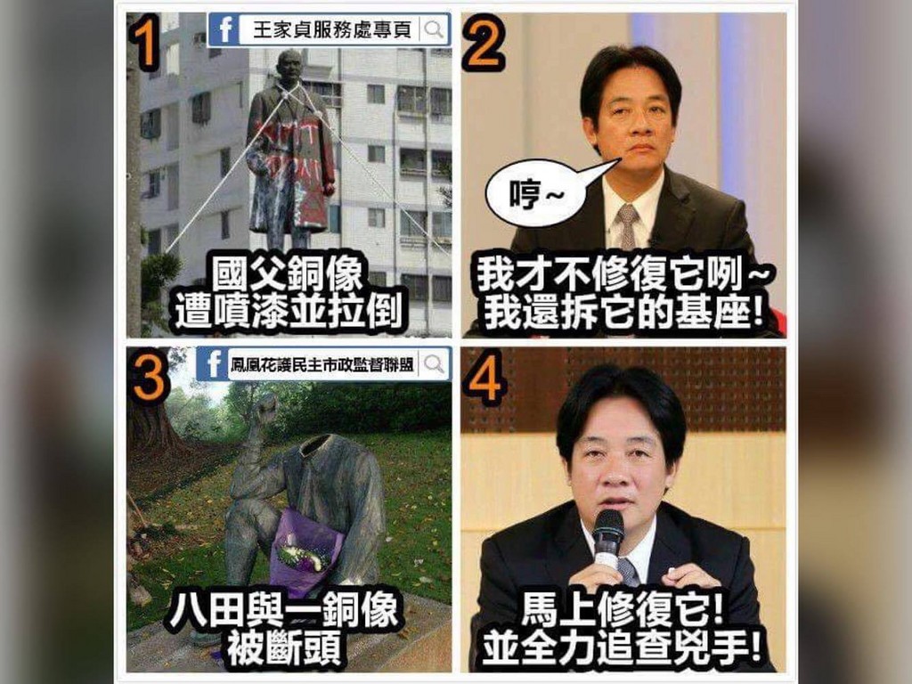 不過,針對八田與一銅像遭斷頭,國民黨台南議會黨團書記長王家貞在臉書「鳳凰花護民主市政監督聯盟」貼文表示,日前國父銅像被噴漆並拉倒,賴清德不但不修復,還拆掉基座,這次八田與一銅像被斷頭,賴清德卻立刻指示馬上修復並全力緝凶。