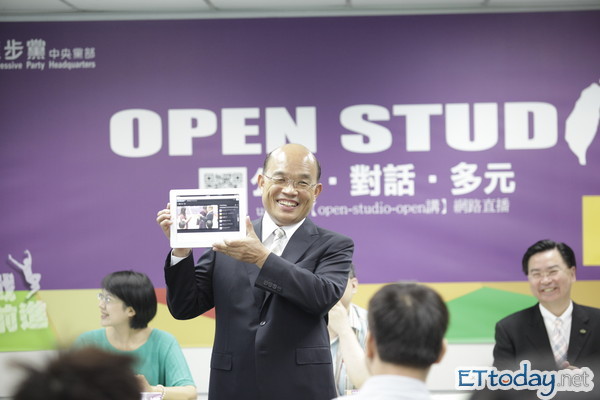 ▲民進黨於21日啟動「Open Studio」研討會,主席蘇貞昌透過iPad啟動線上直播,讓網友能夠在網路上即時觀看並參與討論。(資料照片/民進黨文宣部提供)