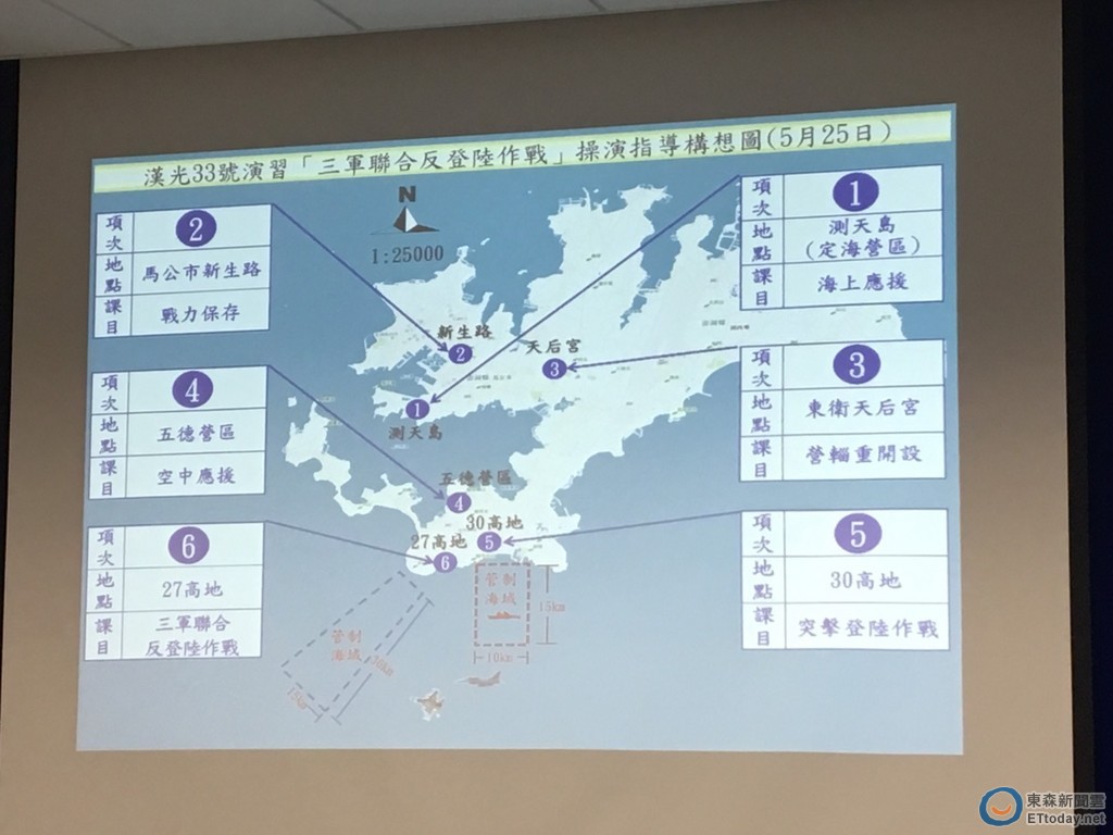 根據規劃,軍方將在5月25日於澎湖進行「三軍聯合反登陸作戰」操演,分別在測天島(定海營區)、馬公市新生路、東衛天后宮、五德營區、30高地、27高地等地方演練相關課目。