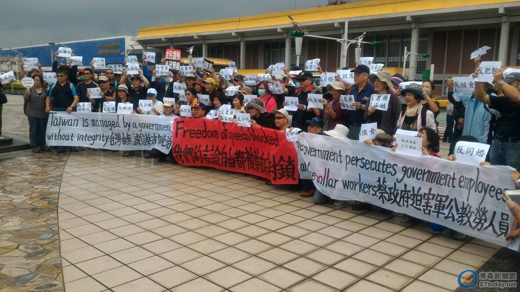 ▲彰化軍公教聯盟在松山機場捷運站3號出口舉牌抗議。(圖/記者柳名耕翻攝(下同))社會中心/台北報導反年金改革的軍公教團體18日、19日將接連2天到立法院抗議,自18日下午就開始集結,其中彰化縣軍公教聯盟召集人吳萬固動員2輛遊覽車共86人北上聲援夜宿圍城,13點時許抵達松山機場成員就各自散佈在機場周邊舉牌。航警局台北分局與松山機場代表與吳萬固溝通協調,最後同意在松山機場捷運站3號出口舉牌抗議,在下午13點40分時86人就離開機場前往晚間「夜宿圍城」的抗爭地點。
