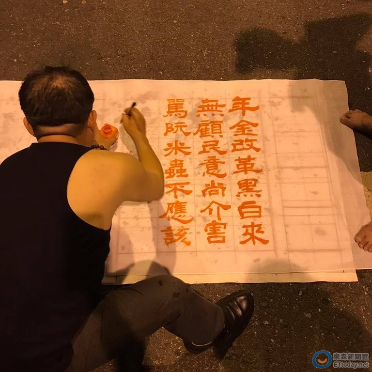 ▲抗議民眾現場蹲馬步、飆書法抗議。(圖/記者陳弘修攝,下同)