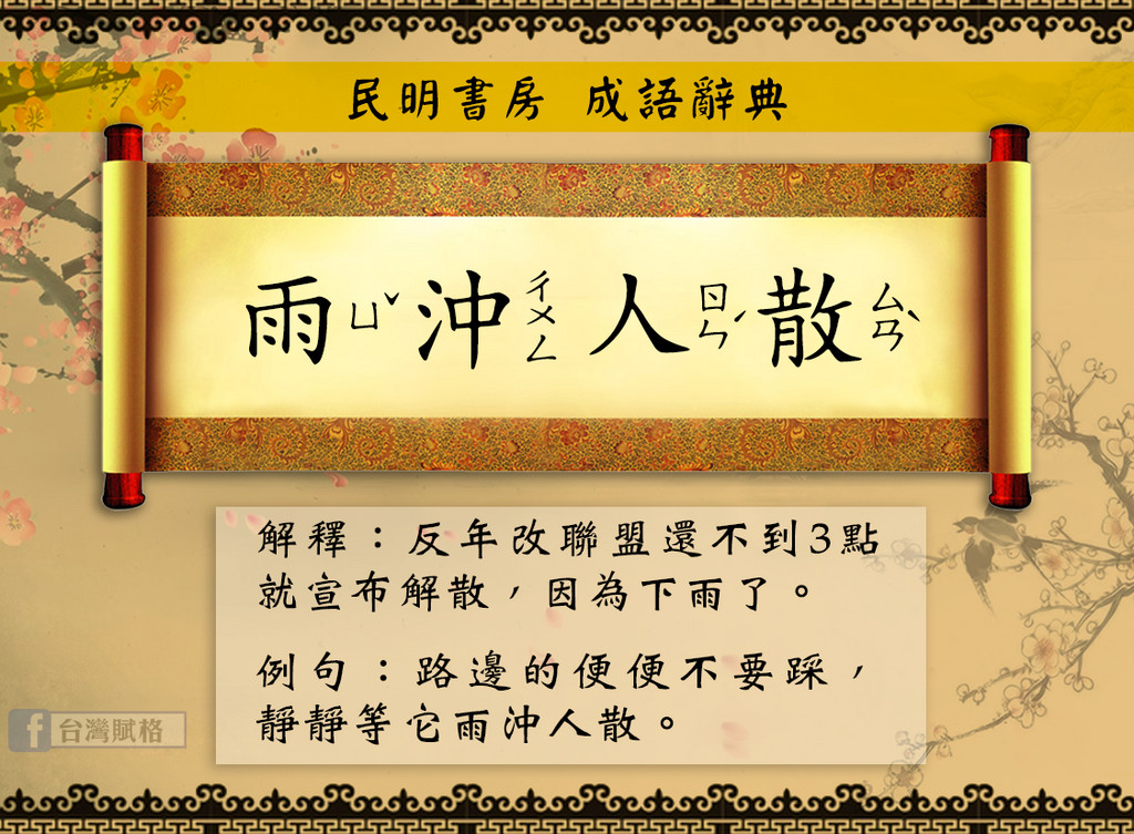 立法院司法及法制委員會19日審查年金改革相關法案,最後經過朝野協商,藍綠都同意下週召開2場公聽會,再進入逐條審查。而抗議群眾也在下午宣布抗爭勝利,隨即迅速解散。網友因此創新成語「雨沖人散」,嘲諷反年改團體因抗議過程碰到大雨,就宣布解散。