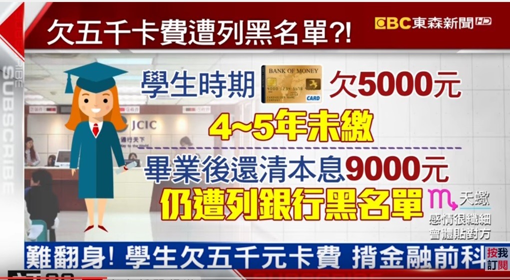 呆帳太久,小心留下金融「前科」!一名網友在網路上求助,自己學生時期欠了卡費5000元,但欠了4至5年,出社會繳清本息共9000元,現在即便有50萬活存,還是被銀行列黑名單,在同家銀行核卡都不過,對此,財團法人金融聯合徵信中心經理李秀鳳表示,「各項資料都有一定的揭露期,要等期滿才會自動下線。」