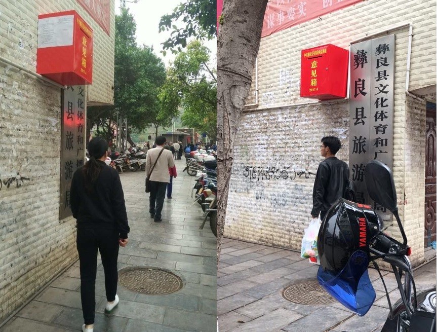 ▲昭通市彝良縣的旅遊局大門外設有意見箱,不過卻設在離地2公尺的位置。(圖/翻攝自微博、雲南網)