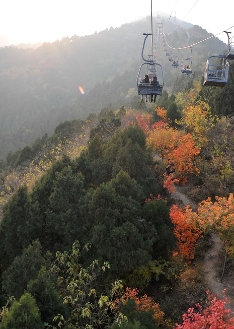 ▲遊客在香山乘坐纜車欣賞紅葉。(圖/新華社)