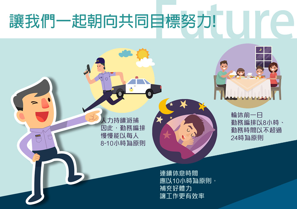 對於外界批評警力過勞、不斷有員警因勤務過重倒下的新聞;警政署表示,往後會要求在警力逐年補充的情況下,所有主管及幹部都應該重新盤點工作需求;逐步將勤務時數回歸至常態編排,即每日8~10小時,要求各單位應派補人力提高常態編排天數;連續休息時間,應以10小時為原則;輪休前一日,勤務編排以8小時、勤務時間以不超過24小時為原則。