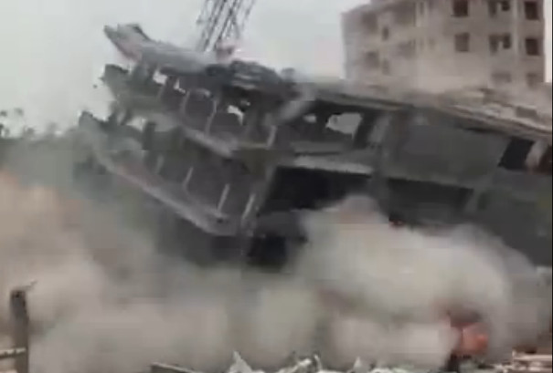 一棟7樓高的大樓在進行拆除工程的時候,意外倒塌,正在負責拆除的挖掘機5秒內瞬間被活埋。駕駛甘先生表示,「我看著那個房子,有點想塌」就趕快棄車離開,幸運逃過一劫。