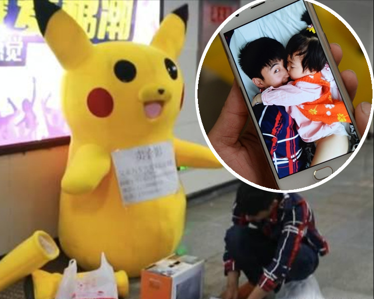 四川成都金牛萬達廣場附近,日前出現一隻「皮卡丘」。他身邊有幾張照片及募捐紙箱輝。紙箱上寫著:「出售合影照,父親為女兒籌集醫療善款」。脫下「皮卡丘」服裝,原來是一名年青人:90後的爸爸劉躍輝。