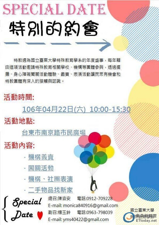 國立臺東大學特殊教育學系將於4月22日(星期六),上午10點時至下午3點30分於南京路市民廣場,舉行系上年度盛事:特教週-「Special Date特別的約會」。希望藉由闖關遊戲、活動表演、宣導攤位,介紹不同的身心障礙類別,讓大眾體會特殊族群平常生活所有的感受,同時透過園遊會的方式,讓更多民眾了解特殊教育。