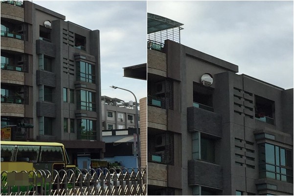 一棟5層樓的建築物,5樓陽台的頂端竟然高高掛起一面「路邊車用反光鏡」,在路上特別引人注目,只是為什麼要把反光鏡高掛在那?特殊的用意也引起網友熱烈討論。