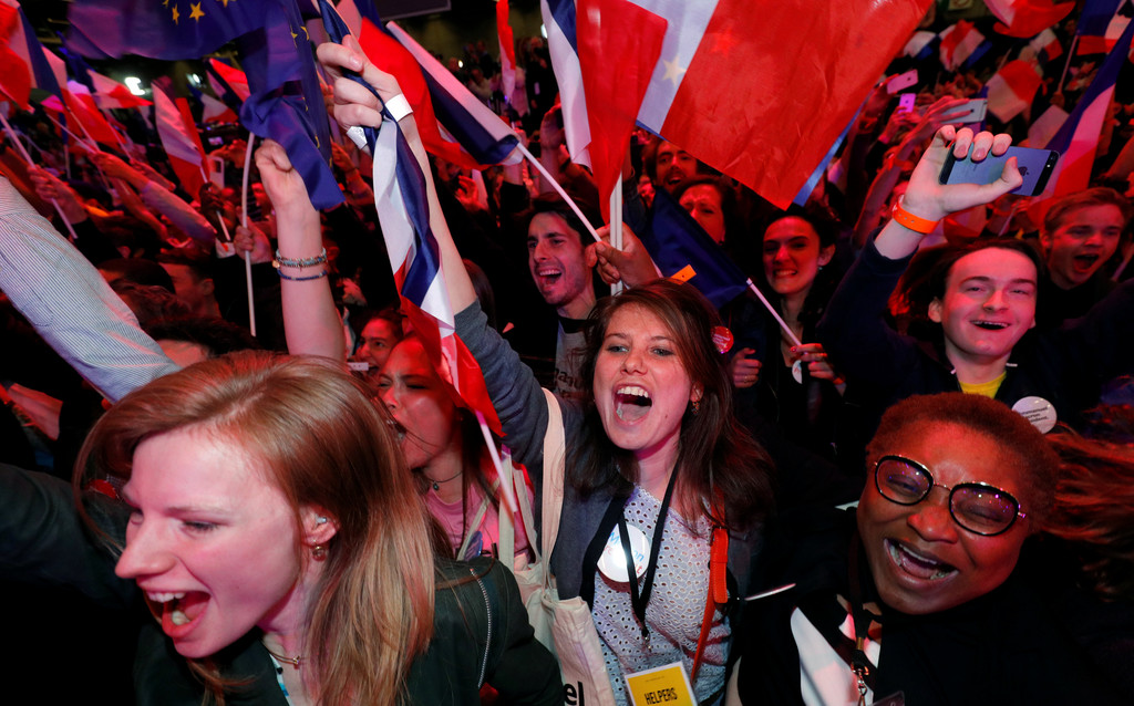 ▲馬克宏的支持者得知闖進第2輪,開心得大吼揮旗。(圖/路透社/下同)