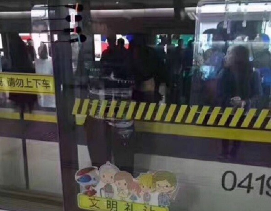 ▲搭地鐵當低頭族,結果卻卡在車門與安全門之間。(圖/翻攝自微博)