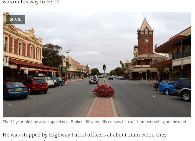 澳洲一名12歲的男孩想要挑戰開車橫越澳洲,竟然獨自開車從東岸肯德爾(Kendall)的住家出發,最後歷經14小時、1300公里後才被警方在偏僻的採礦小鎮布羅肯希爾(Broken Hill)攔下,此時他幾乎橫跨了整個新南威爾斯州了,這也是全程的三分之一。