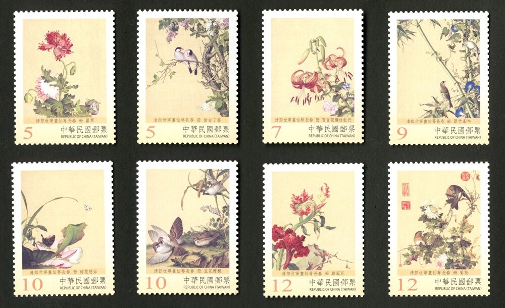 下輯郵票1套8枚,圖案分別為「清郎世寧畫仙萼長春 冊 罌粟(面值5元)、紫白丁香(面值5元)、百合花纏枝牡丹(面值7元)、翠竹牽牛(面值9元)、荷花慈姑(面值10元)、豆花稷穗(面值10元)、雞冠花(面值12元)、菊花(面值12元)」,花鳥寫生造型考究,用色鮮麗豐富。