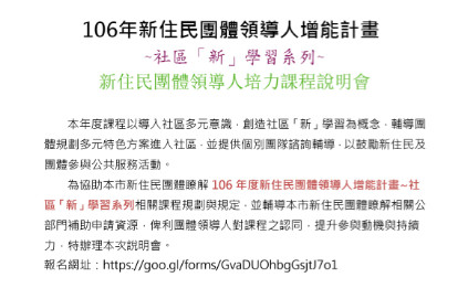 高雄市政府社會局為協助本市新住民團體瞭解106年度新住民團體領導人增能計畫~社區「新」學習系列相關課程規劃與規定,特預定於4月30日辦理說明會。