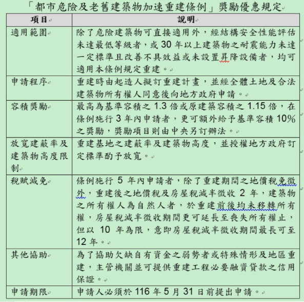 內政部表示,「都市危險及老舊建築物加速重建條例」明定適用範圍除了危險建築物可直接適用外,經結構安全性能評估未達最低等級,或30年以上建築物耐震能力未達一定標準,且改善不具效益或未設置昇降設備,均可適用。申請程序則由起造人於重建時擬訂重建計畫,並經全體土地及合法建築物所有權人同意後向地方政府申請。提供的容積獎勵最高為基準容積的1.3倍,或原建築容積的1.15倍。