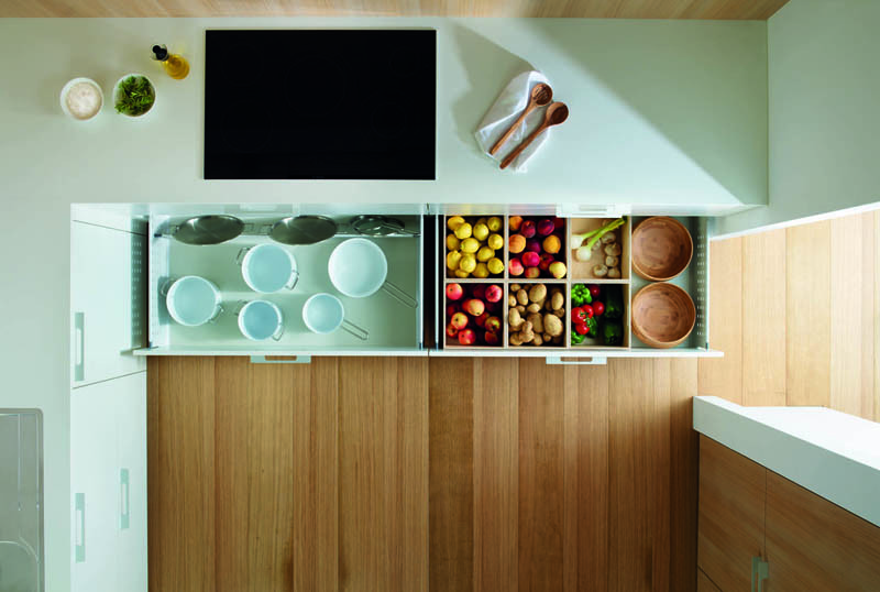 透過模組化設計,將不同功能的盒子放在抽屜內,120公分的抽屜平均可以放置4個模組,每一個模組都是活動、具有彈性的,都可以取出清洗;而使用者可自行透過自由排列,將廚具收納磨合到最順手的狀態。