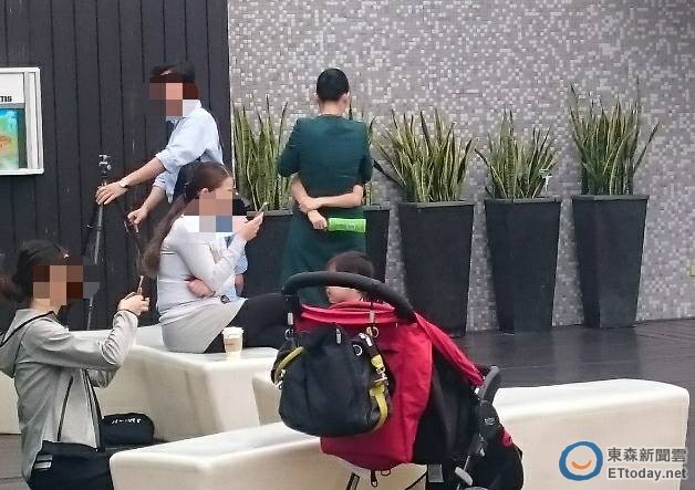 過了10分鐘,一名上全妝、梳著包頭的空姐向他們走過來,只見她一坐定,這位爸爸馬上拿著相機,不停地對她們拍攝,不僅拍下互動,還將相機放上腳架,確定空姐與小姊弟的位置後,按下讀秒拍攝,自己迅速衝到空姐旁邊合影,數次來回,所有人的目光都聚集在他們身上。