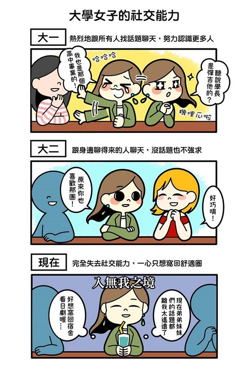少女阿妙24日在臉書粉專PO出一張插圖,表示大學女子的社交能力會隨著年齡漸長而跟著下降,大一還會很積極認識別人,想要跟所有人找話題聊天,努力想要更多人;到了大二漸漸變成只想跟身邊聊得來的人聊天,如果沒有話題也不會強求;而最後就會變成完全失去社交能力,一心只想回到舒適圈,只有自己的世界。