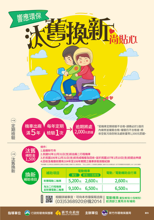市府祭出「新購、換購」電動機車兩種補助方案,補助新購輕型、重型電動機車每輛新臺幣2,600~5,200元,補助淘汰二行程機車換購電動機車每輛6,500~9,100元,即日起受理申請。設籍新竹市、年滿18歲以上市民,每人限申請補助1輛電動機車,設立登記於新竹市公司或法人,限申請補助2輛電動機車。