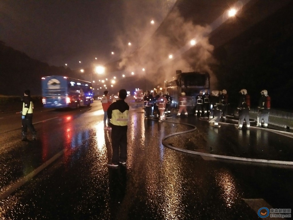 國道1號南下39.8K處26日晚間近9時傳火燒車意外,一輛桃園客運遊覽車行經國道林口路段時,後輪突然起火燃燒,所幸車上含司機24人都已經安全下車,無人受傷。目前燃燒的遊覽車停擺於國道外側路肩等待救援,救護人員晚間9時19分已將火勢撲滅。