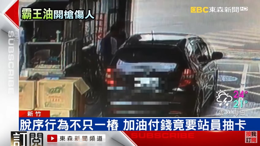 同事見曾男要離開,見狀想追上前,發現對方疑要衝撞,機警地躲開;過2小時、下午2時多,曾男開車回來,一開始在加油站外不斷叫囂,企圖引起員工的注意,接著拿出BB槍,朝加油站連開3槍,造成一名員工左大腿遭BB彈打傷。其他人拿甩棍追上去,還是讓嫌犯逃逸。一旁的銀行也遭波及,被開5槍