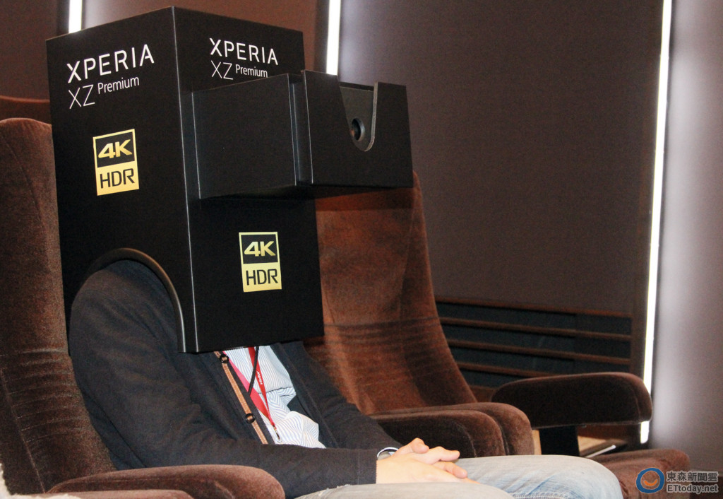 這個黑色箱子有點類似 Google 公司用 Google Cardboard 讓更多人體驗 VR,Sony mobile 開發團隊用這樣的 Xperia XZ Premium 個人劇院,給現場台灣、香港媒體感受新一代旗艦機的影音效果。