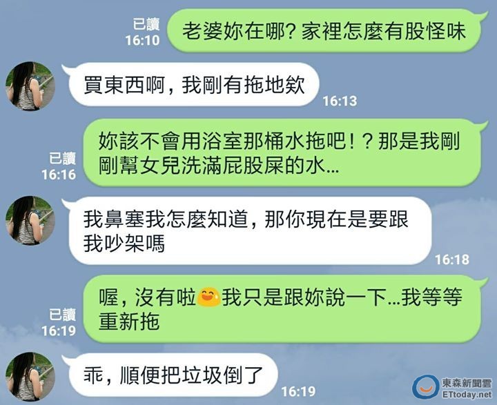 LINE的對話紀錄中,聞到怪味的王家揚傳訊詢問老婆,「你在哪?家裡怎麼有股怪味?」老婆也覺得莫名,「我剛有拖地耶!」王家揚聞言後突然靈光乍現,再度傳訊詢問「你該不會用浴室那桶水拖的吧?那是我剛剛幫女兒洗滿屁股屎的水…!」