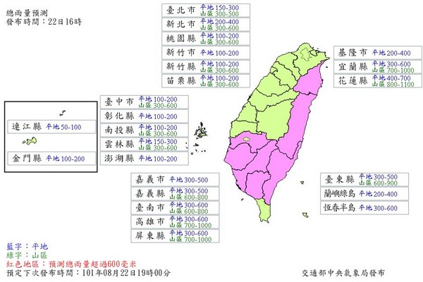 豪雨特報-受天秤颱風影響,22日台灣東北部、東部、東南部地區及北部山區有局部性大雨或豪雨發生的機率,中南部地區午後亦有局部大雨發生的機率,請注意防範坍方、落石、土石流及山洪爆發,低窪地區請慎防