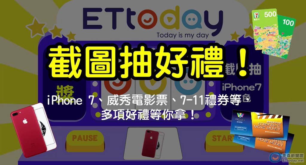 ETtoday換新logo啦!自5月2日起,到ETtoday新聞雲粉絲專頁玩拉霸機,連線成功就有機會免費把iPhone7帶回家!除此之外,還有威秀電影票、500元及100元的小7禮券等你來拿。母親節就快到了,還不把握機會,抽個大獎回家讓媽媽一起跟上潮流吧!