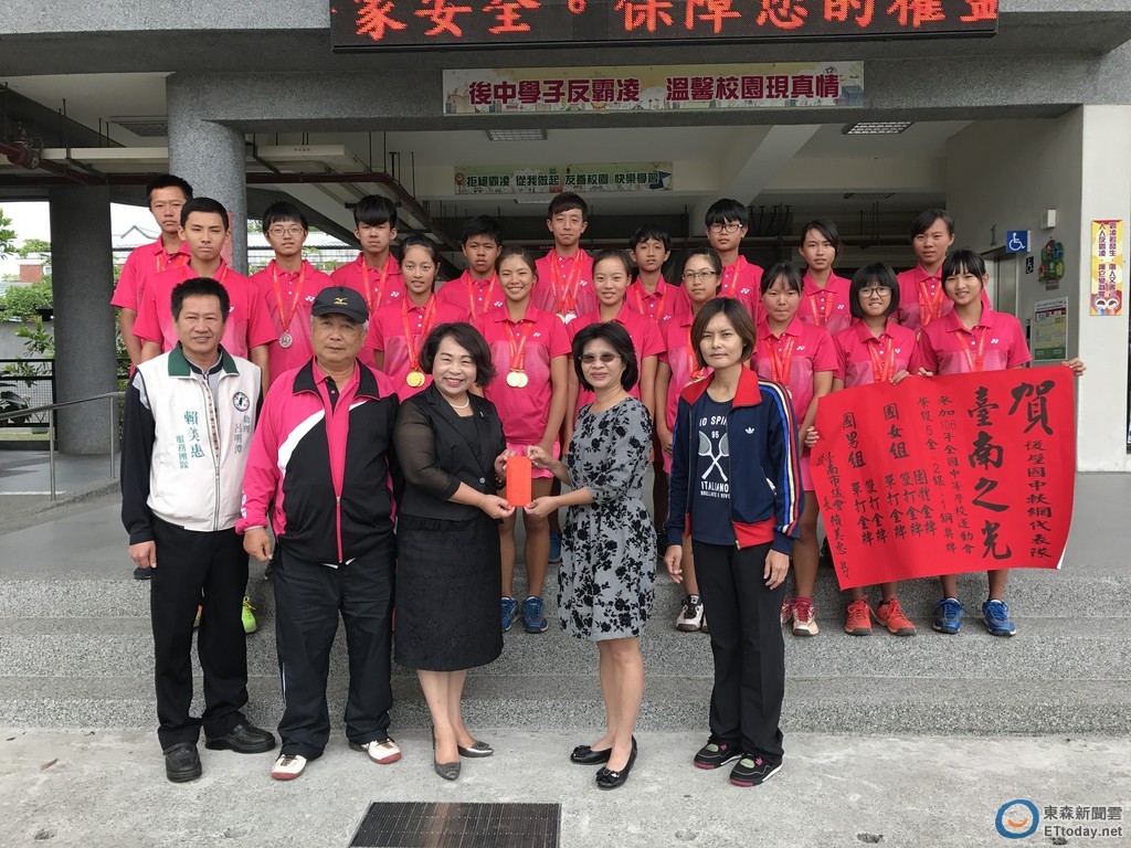 台南市軟網代表隊,參加106全中運軟網比賽拿下9金3銀5銅殊榮,其中議長賴美惠的母校後壁國中軟網隊,更拿下5金2銀1銅紀錄,國中女子組拿下團體金牌、雙打和單打金牌,國中男子組也拿下單打和雙打金牌,後壁高中高女組單打金牌,後壁軟網隊國、高中組選手成績優異,賴美惠28日上午回母校祝賀貼紅榜。