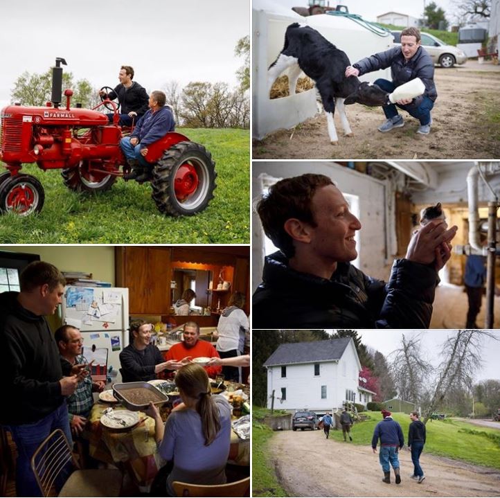 祖克伯昨 (30) 日則是前往威斯康辛州,拜訪住在Blanchardville的格朗特 (Jed Grant) 一家,還在他們的牧場裡第一次嘗試擠牛奶、餵小牛、駕駛拖拉機。他也與格朗特一家共進晚餐並在在臉書分享照片,還說這家人十分勤奮認真。