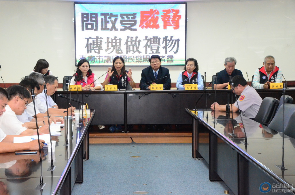 民眾拿磚頭闖台南市議會點名找國民黨市議員,台南市議會國民黨團1日召開記者會,黨團議員紛紛認為此事件跟日前八田與一問政有關,強烈質疑有高人教唆這位遊民進市議會試水溫,書記長王家貞表示,市議員監督問政不應受不同立場民眾暴力威脅,為保全體議員安全,市議會應加強與市警局溝通,有安全漏洞應檢討。