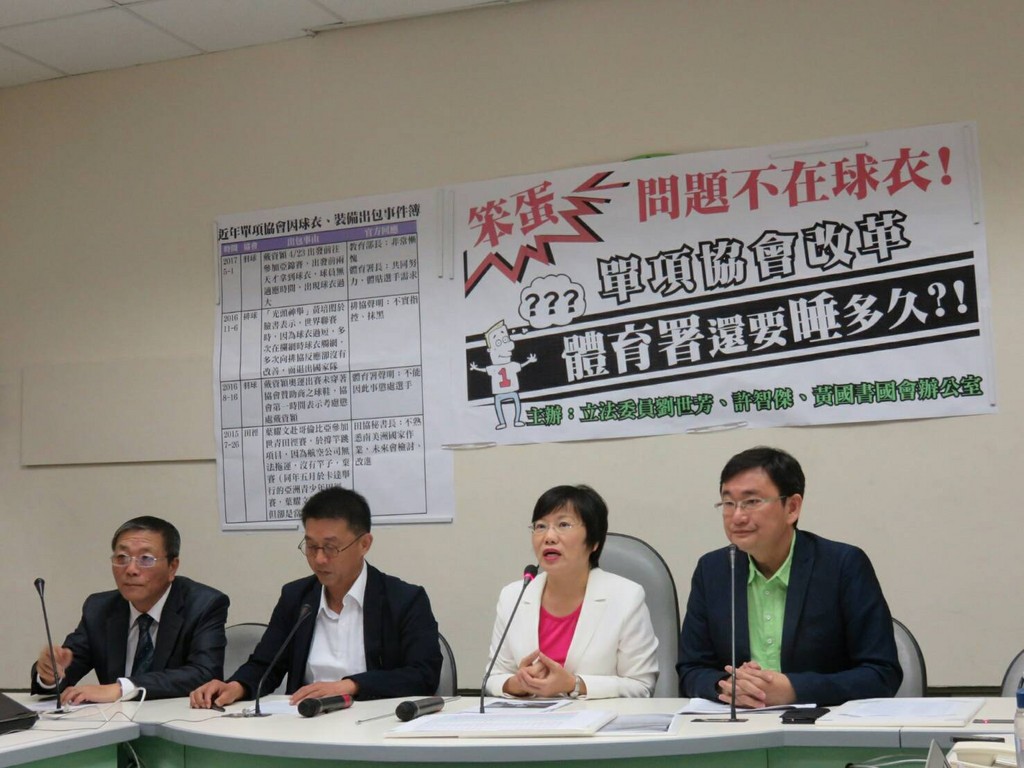 立法院教育及文化委員會明將繼續審查有關單項協會改革的《國民體育法》修正草案。劉世芳、黃國書、許智傑等人上午先召開記者會,劉世芳說,各單項運動協會兩年來起碼就發生4次:戴資穎兩次,里約奧運球鞋事件、亞錦賽球衣過大;另外二次則是去年有「光頭神舉」之稱的排球國手黃培閎反映球衣過短而後退出國家隊,及撐竿跳選手葉耀文無竿可跳。
