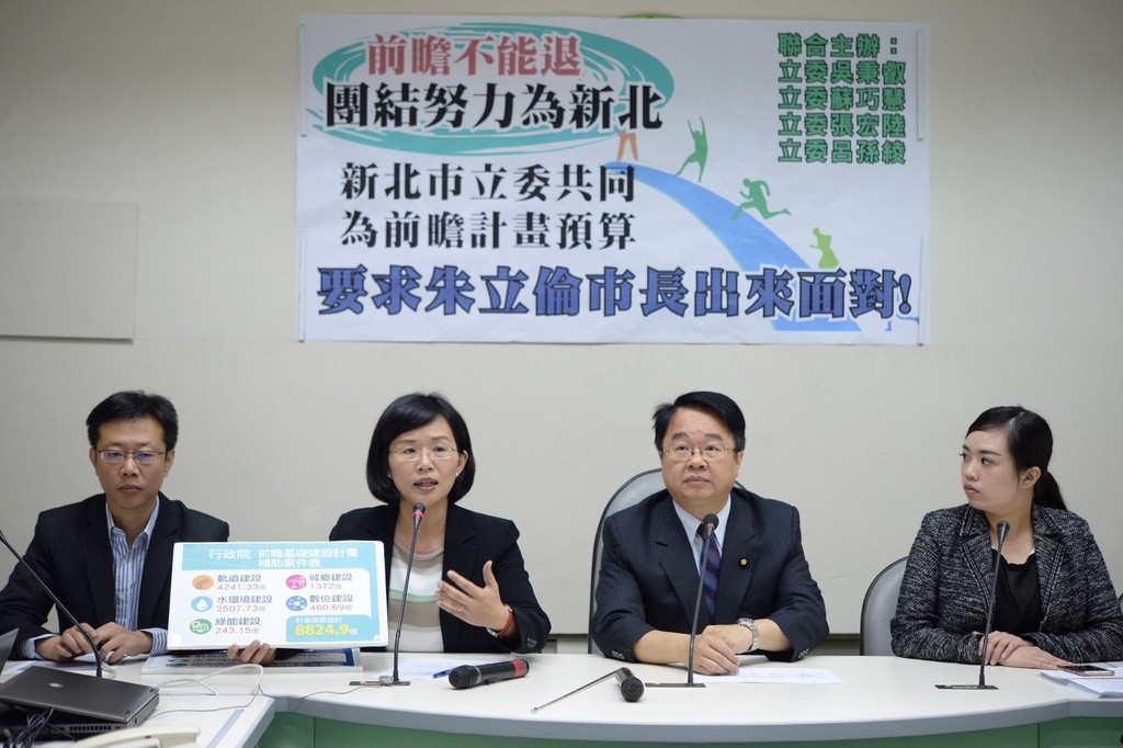 呂孫綾則說,各地方父母官都在為地方爭取建設,但新北市長朱立倫從頭到尾只出席一場4月17日的軌道建設公聽會,過程中也沒跟在地立委接觸,別說是溝通,只用電子公文就要爭取預算,手法粗糙、也非常不尊重新北市立委,呼籲朱拿出最好計畫前應多與地方溝通配合,才是新北市民最大福氣。張宏陸也指出,新北市政府看似爭取很多經費,但行政院計畫中城鄉建設佔了1372億,新北市政府僅提23億,要呼籲「不要為了一個軌道建設,而忽略其他。」