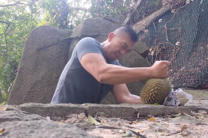 ▲李嘉徒手狂打榴槤。(圖/翻攝自kali1680 YouTube)