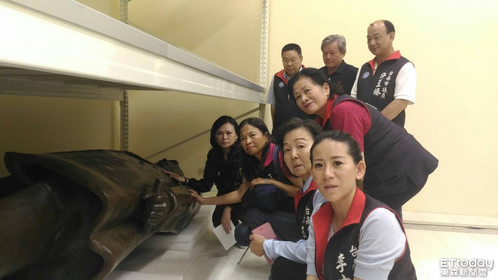 ▲台南市政府文化局帶領著市議員前往柳營科技暨環保園區探視,發現國父銅像「橫躺」在所謂的典藏架上。(圖/國民黨團提供)