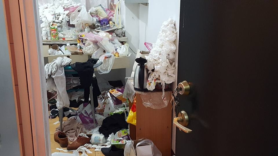 直到5月3日、租約到期後,原PO才會同警方一起開門查看房間狀況,不料眼前的景色卻讓她當場傻在原地。門一打開後,映入眼簾的是成堆的衛生紙,堆得高高的宛若一座又一座的小山,只要是房內的平面置物空間,舉凡桌面、櫃子上,全部被堆了滿滿的使用過的衛生紙、塑膠袋、空飲料罐,就連地板也散落各式各樣的雜物,幾乎無法立足。