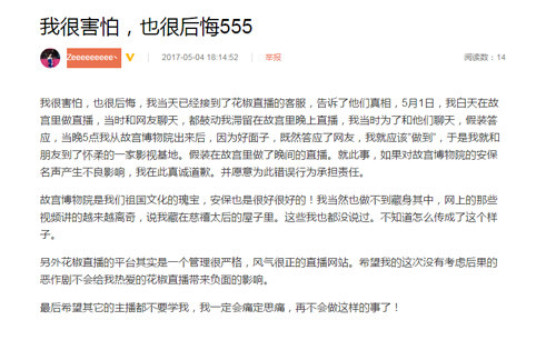 女主播昨日18時在微博發表文章表示,自己只是為了「好面子」而假裝在故宮直播,實際上是在懷柔的一家影視基地做晚上的直播,「網上的那些視頻越講越離奇,說我藏在慈禧太后的屋子裡,這些我也都沒說過,不知道怎麼就傳成了這個樣子」。文章中還對故宮的安保表示道歉,「故宮博物院是我們祖國文化的瑰寶,安保也是很好很好的!」願意為自己的行為負起責任。