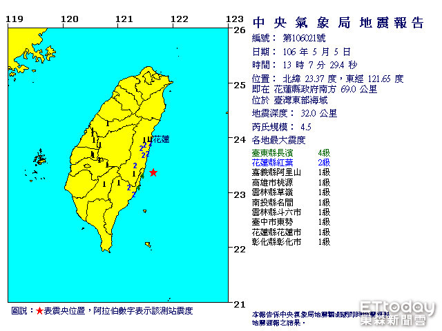 地牛翻身!5日下午1時7分,台灣東部海域(花蓮縣政府南方69公里)發生芮氏規模4.5地震,地震深度32公里。根據中央氣象局地震測報中心數據顯示,各地最大震度台東4級、花蓮2級、嘉義、高雄、雲林、南投、台中、彰化均為1級。