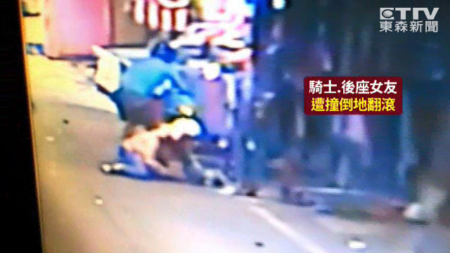 另一個角度顯示,機車被撞之後,騎士和後座的女友一起慘摔在地,2人翻滾了幾圈才站起來,騎士疑似追上前企圖理論,女友則是痛得蹲在地上,一旁民眾看了紛紛上前幫忙。目擊攤商說,「你怎麼追他?他是開車耶,跑得很快,又拿球棒,我們站在這裡而已啊,我們也不敢出去啊!」