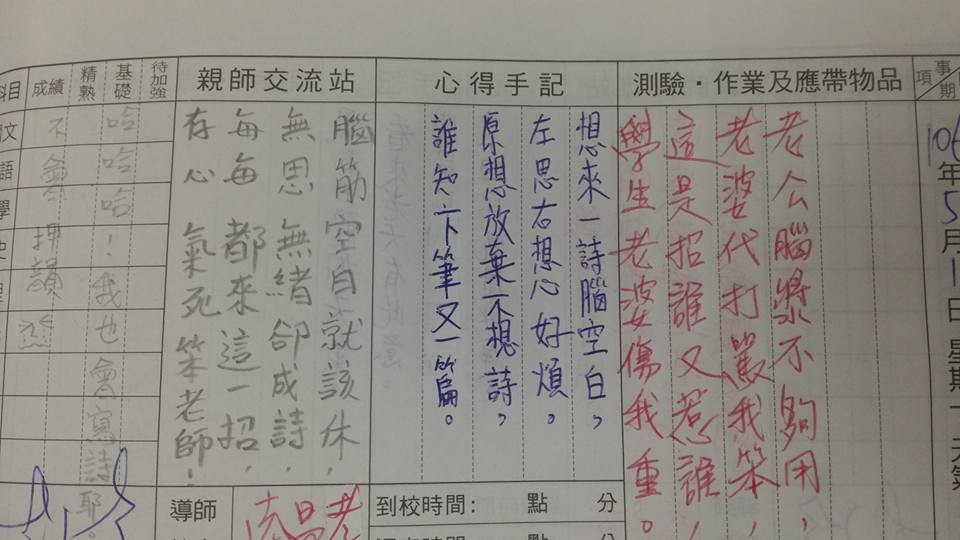 桃園市新屋國中8年級10班的「寫詩聯絡簿」,師生「用筆交戰」的過程超有趣,最近連「師母」都加入戰局,又掀起新一波高潮。